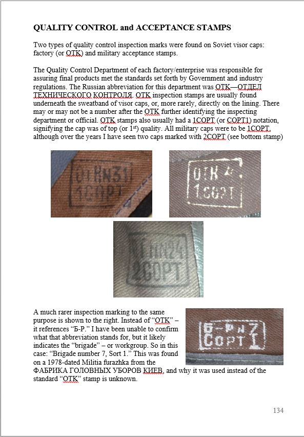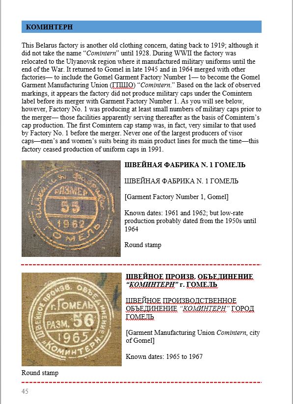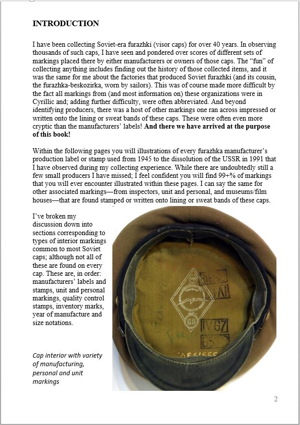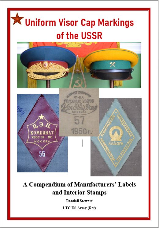 "Uniform Visor Cap Markings of the USSR - A Compendium of Manufacturers' Labels and Interior Stamps"Sourcing original Soviet documentation and reflecting personal observation of hundreds of caps, this book is the latest (and last) edition that provides the only comprehensive illustration of Soviet-era interior cap markings in any language. Such markings are extensive; ranging from manufacturers’ stamps and labels, to unit identifications, to personal owner’s information and various inspection and inventory markings. Examples of all markings are pictured, Russian/Ukrainian text and abbreviations are explained and a full English translation of each is provided. Histories of the primary headdress manufacturers, along with known dates of use of each manufacturer’s label/stamp variant are also recorded. Since interior markings are often heavily worn and largely illegible, this book will help collectors date and fully identify the origin of their caps. Because interior markings serve as a primary means of determining cap authenticity, the reader can also more readily detect fakes and reproductions. Anyone wanting to own a copy of this unique, expanded 142-page, 7 x 10 inch format book can order it by contacting me directly at randallstewart@comcast.net. I will also be listing it on Amazon. If ordering directly from me, purchasers in the U.S. can pay with check or money order or by PAYPAL (to randallstewart@comcast.net) or Google Wallet - but please wait for my reply to your email before paying!. Purchasers outside the U.S. are encouraged to use PAYPAL if available to them but if not, contact me at randallstewart@comcast.net and we can discuss other payment arrangements. Book purchase price is $44.50 (U.S.) with free postage within the US. Paypal fee will add $3.50. International customers should contact me for postage costs prior to payment since such U.S. Postal charges are unfortunately pretty high now. Some page samples from this book are shown below: |