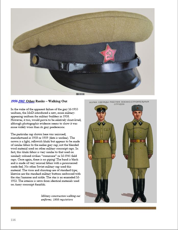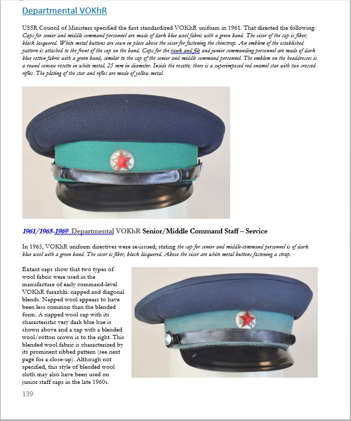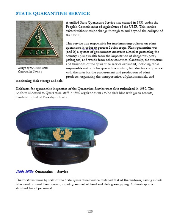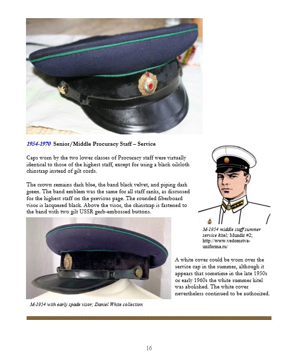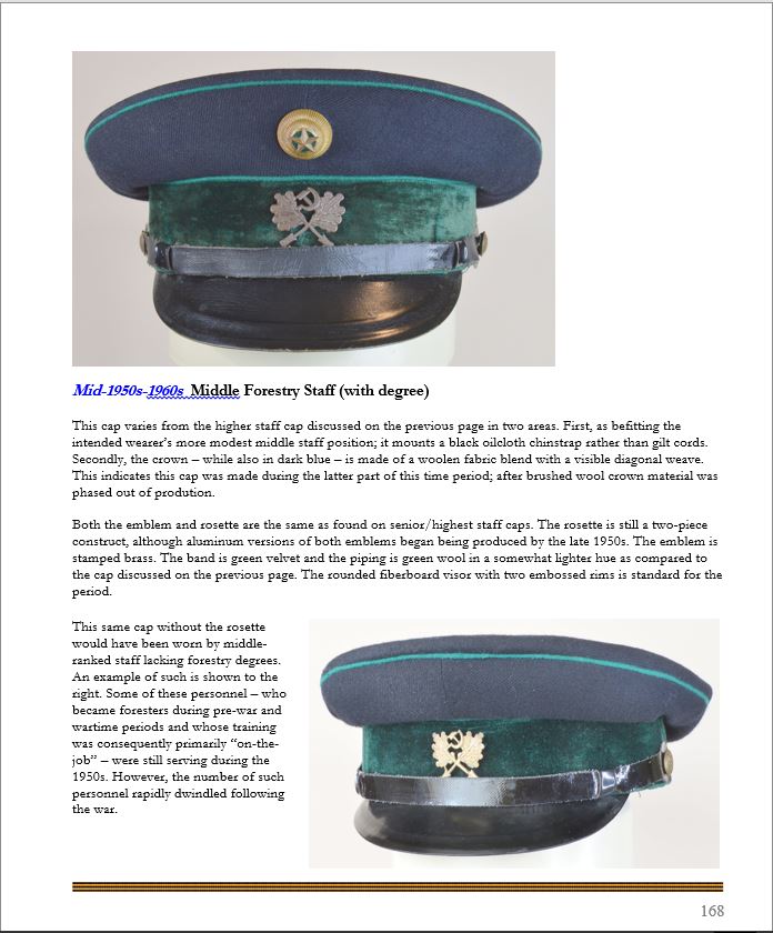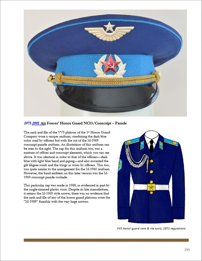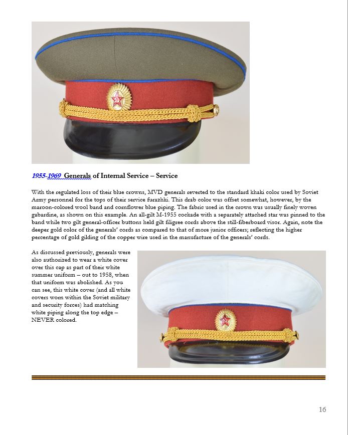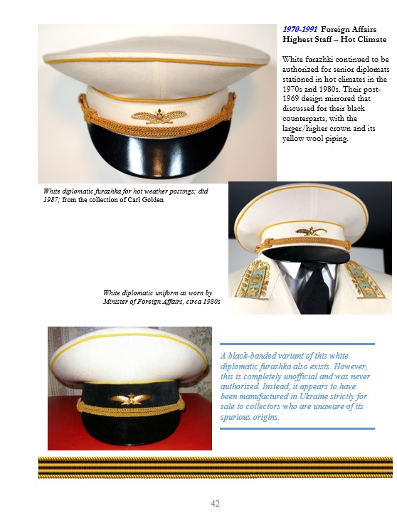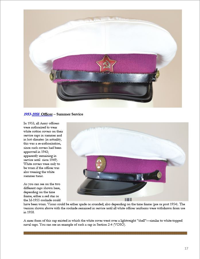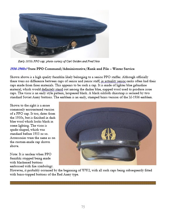 "Uniform Caps of Soviet Ministerial Organizations (Vol. II)" NEW“Uniform Caps of Soviet Ministerial Organizations - The definitive guide to of the Procuracy, the commissariates/ministries of Customs, Foreign Affairs, Finance, State Control, Procurements, and Power, and of Fire Protection and other uniformed agencies of the Soviet era. This book will expand on its volume I predecessor by covering visor caps worn by staff of the Procuracy, the ministries of Customs, Foreign Affairs, Finance, State Control, Procurements and Power, as well as a number of lesser-known departmental organizations. Uniform wear by some of these ministries was limited to a brief period of time and/or to small subgroups but are unique or distinctive enough to merit more coverage than you can find in traditional publicized venues. That coverage will, to the best of my ability, illustrate and describe EVERY cap variant making up uniforms belonging to these organizations from 1918 through the collapse of the USSR in 1991. It is printed in the same 8 x 10 inch format as its predecessors, featuring high quality gloss paper and heavy paper stock covers. It consists of 140 full color pages with over 240 photos/illustrations. 8 x 10 inch paperback format printed in full color on heavy, gloss-finished paper, with over 240 photographs and illustrations on 140 pages. Price for the hardcopy paperback is $50 with free postage to addresses within the US. If interested, please send me an email at: randallstewart@comcast.net. Buyers in the U.S. can pay with check or money order or by PAYPAL (to randallstewart@comcast.net) - but please wait for my reply to your email before paying! I must ask Paypal users to add $2.50 to the total price to cover their fees. Purchasers outside the U.S. are encouraged to use PAYPAL if available to them but if not, contact me at randallstewart@comcast.net and we can discuss other payment arrangements and postage costs. Some page samples from this book are shown below: