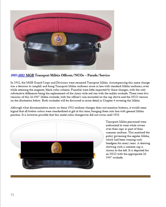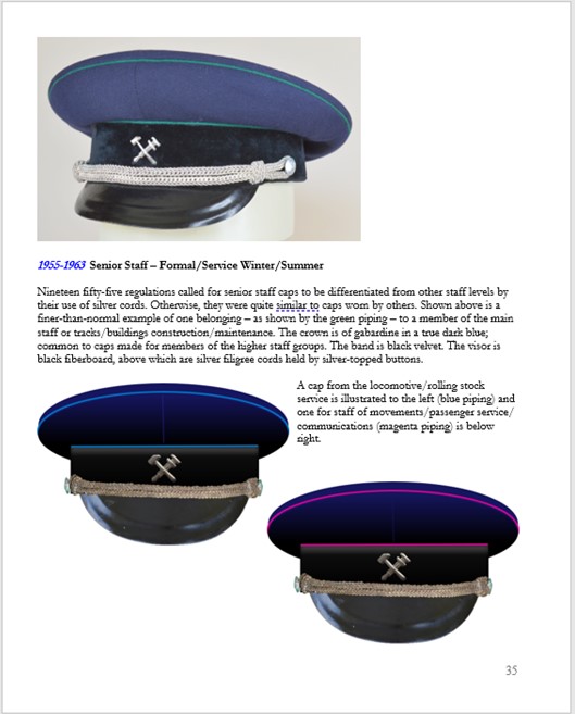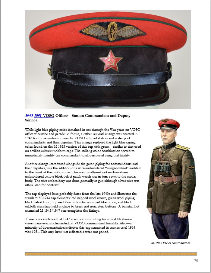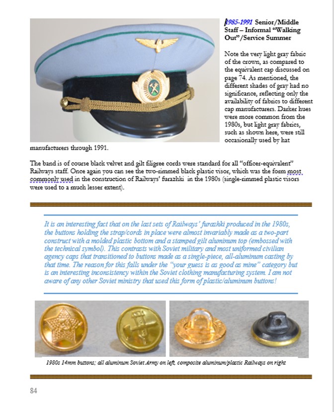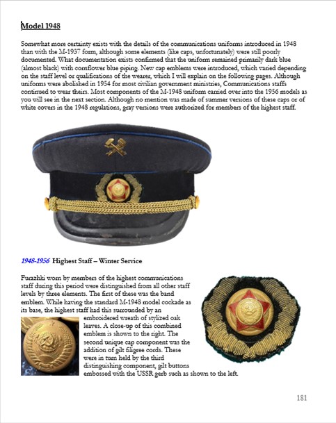 "Uniform Caps of Soviet Ministerial Organizations (Vol. I)"“Uniform Caps of Soviet Ministerial Organizations - The definitive guide to Railways, Mining, Motor Transport, Electric Transport and Communications/Postal caps of the Soviet era." As with my previous books, I am confident you will find this volume to be the most comprehensive book available on caps worn by these civilian governmental organizations, unmatched by any other source of reference in any language. 8 x 10 inch paperback format printed in full color on heavy, gloss-finished paper, with over 350 photographs and illustrations on 196 pages. Price for the hardcopy paperback is $70 with free postage to addresses within the US. If interested, please send me an email at: randallstewart@comcast.net. Buyers in the U.S. can pay with check or money order or by PAYPAL (to randallstewart@comcast.net) - but please wait for my reply to your email before paying! Since my profit margin is so slight on these books - in order to maximize its availability to collectors - I must ask Paypal users to add $3.50 to the total price to cover their fees. Purchasers outside the U.S. are encouraged to use PAYPAL if available to them but if not, contact me at randallstewart@comcast.net and we can discuss other payment arrangements and postage costs. Some page samples from this book are shown below: